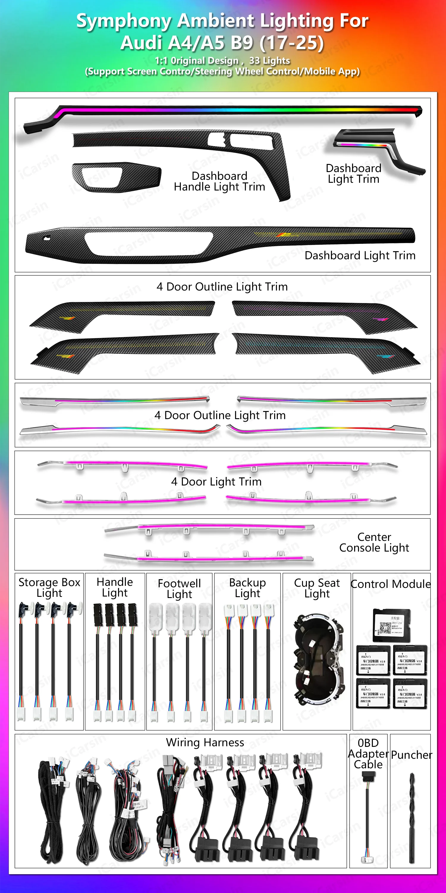 Our ambient light kit is the perfect way to add a touch of luxury to your Audi.With its bright illumination and 256 color adjustable options, you can easily transform the interior of your car and create a new ambiance and feeling for you and your passengers.